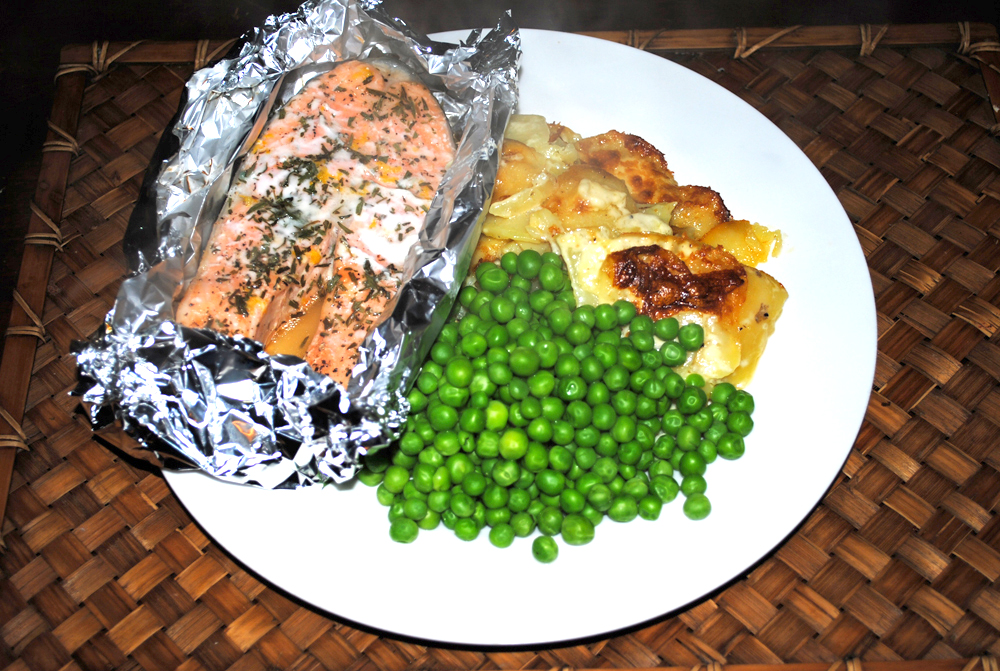 Smoked salmon with baked potato and pea puree. The pea puree was an experiment. No recipe, I just cooked the peas as normal then blended it with a little of the cooking water, salt, pepper and butter. It was very sweet and yummy. The colour was much lighter than the skin of the pea that we are used to seeing. I guess pea guts are just a different colour to their skin.