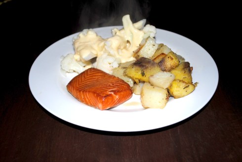 Smoked salmon, rosemary and garlic roast kumara and potato chunks, cauliflower and maasdam cheese sauce.