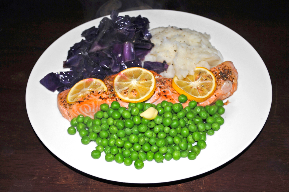 Baked salmon with a generous smattering of Himalayan salt, herbs and lemon.