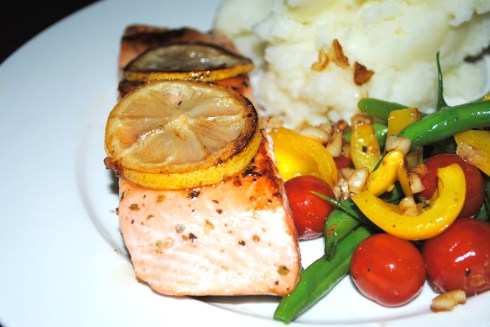 Pan fried salmon with oregano and lemon slices. Potato mash. Beans and tomatoes from the garden stir fried with garlic and yellow capsicum.