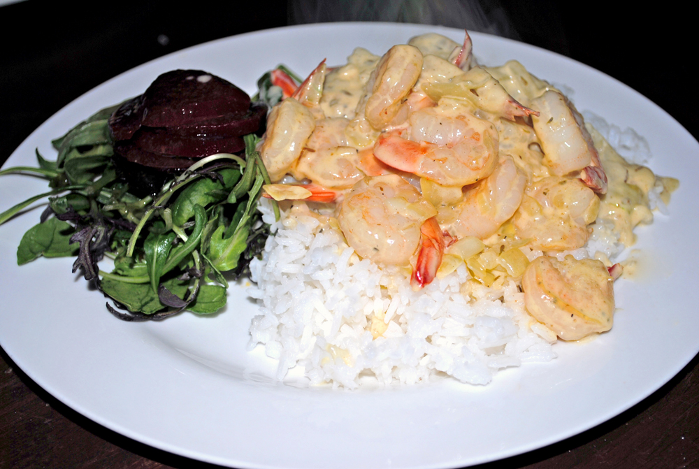 Saute half a diced onion and a couple of cloves of chopped garlic in some butter. When those are cooked, add enough prawns for 2 and cook until just done. Add half a cup of cooking wine and once that reduces down, add half a cup to a full cup of cream (depends on how saucy you want it), plenty of salt and pepper and a good pinch of dried herbs. Serve immediately on rice to soak up all that creamy goodness. Better add something green on the side to cut through all that richness!