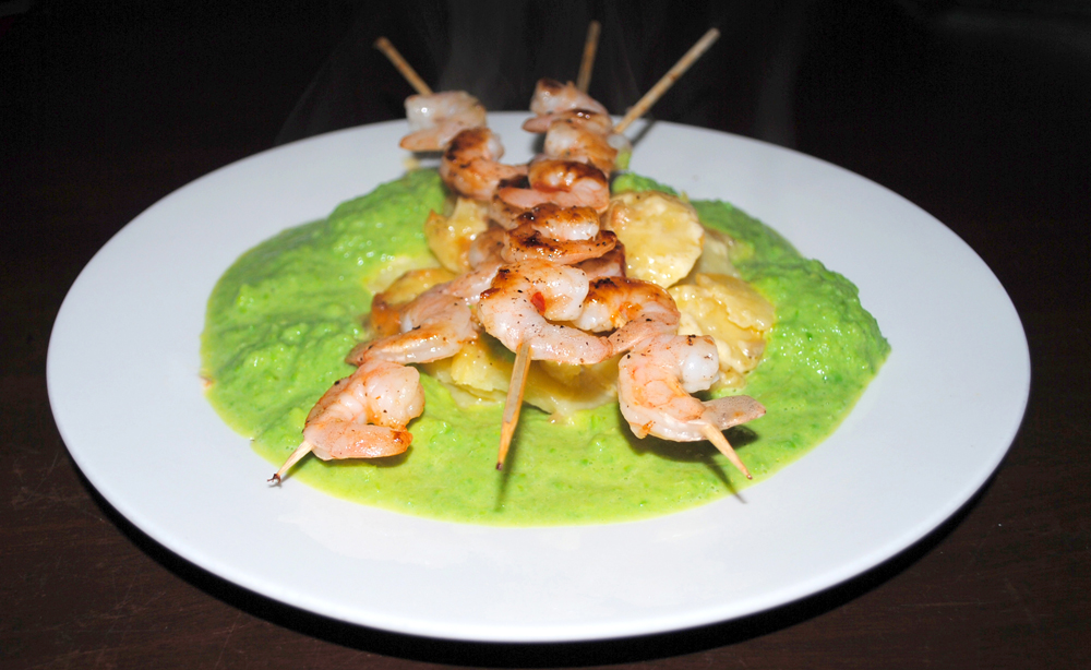 You make cheesy potato gratin with pea puree and sweet chili prawn skewers of course!