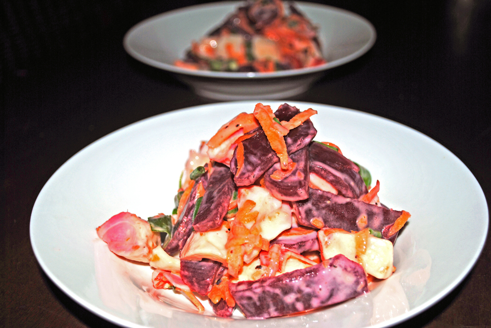 Surimi Salad: Surimi, grated carrot, beetroot, dressing. Plus cherry tomato, green beans and spring onions from our garden.
