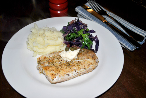 I sauteed some red cabbage with some chopped streaky bacon and towards the end of cooking, added butter and the freshly picked broad bean shoots. Pan fried some fish coated in breadcrumbs and herb with a dollop of mayo and capers, served with mashed potato.