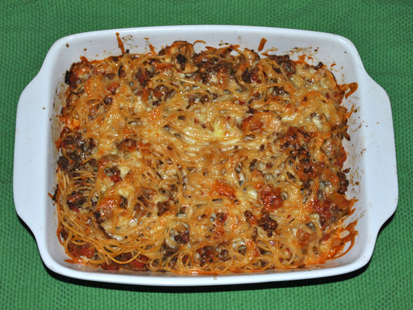 - Cook pasta until al dente. Don’t overcook as it will cook further in the oven. Drain pasta and pour into an oven proof dish.