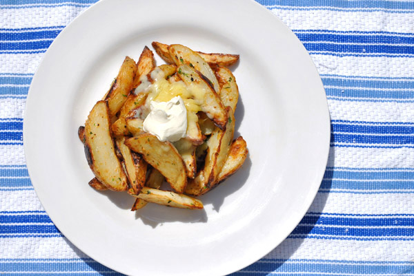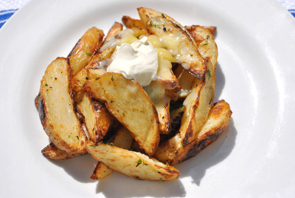 - Arrange potatoes onto a lightly oiled oven proof dish. Stand every piece up so that the skin is the only thing touching the dish.