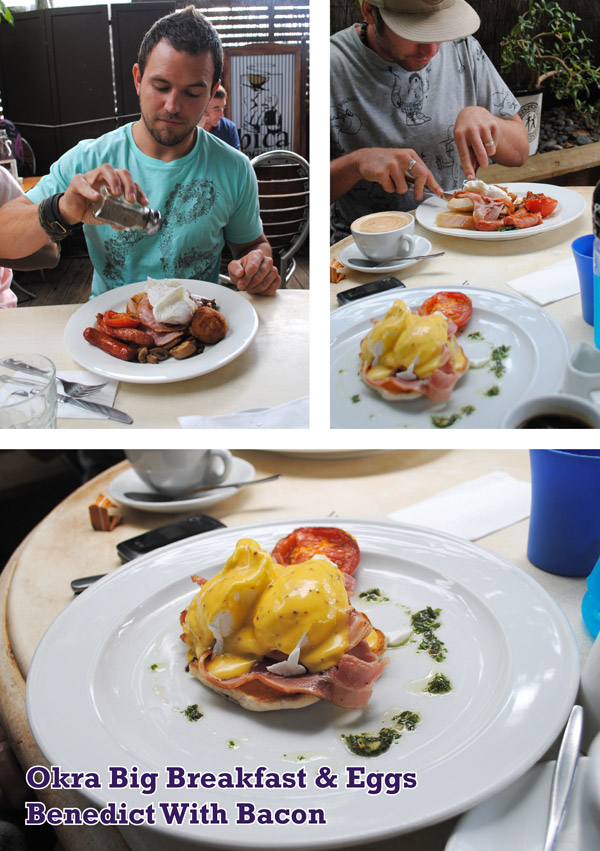 Okra, one of my favourite local brunch spots used to offer Bus-Stop Eggs (served in the pan). This was a dish of spiced lamb koftas and capsicum in a tomato sauce, baked with eggs ($15.50). Fairly exotic. Unfortunately, they took that off the menu, but they’ve replaced it with what they call Spanish Breakfast which is pretty similar, still served in a cast iron pan, but with beans and ham instead of lamb and capsicum.