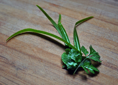 My bouquet of onion weed, sage and coriander just before I chopped it up and added it to my scrambled eggs.
