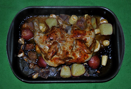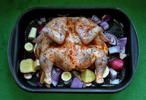 8. Arrange the butterflied chicken, skin side down on top of the vegetables in the roasting dish.