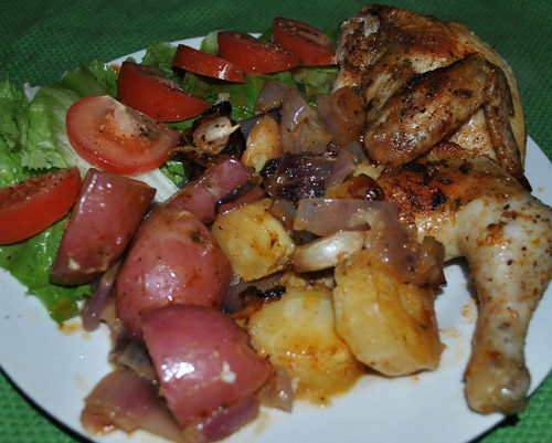 Use whatever root vegetables you like. This time, I used red skinned potatoes, red onion and parsnip.