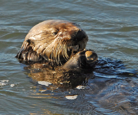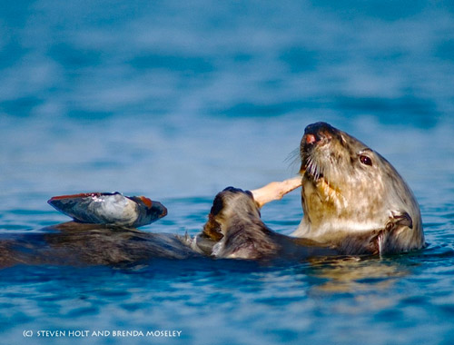 This sea otter has removed the meat from the shell and is reserving the shell on it’s makeshift table. Photography by Steven Holt and Brenda Moseley.