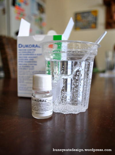lol. It does look pretty refreshing doesn’t it? It made me a bit nervous drinking something with cholera bacteria and toxins in it though. I feel fine now. I’m planning to eat just about everything. This elixir only protects from E.Coli and Cholera so if I ate something that was contaminated with Salmonella for example, I’d still get sick. But I’m also armed with other drugs if I get any symptoms. I got really sleepy so had a nap (though I can’t be sure if it was the effects of the night before or the vaccine). My tummy made a few loud noises and I wanted to go to the bathroom, but no side effects. TMI?