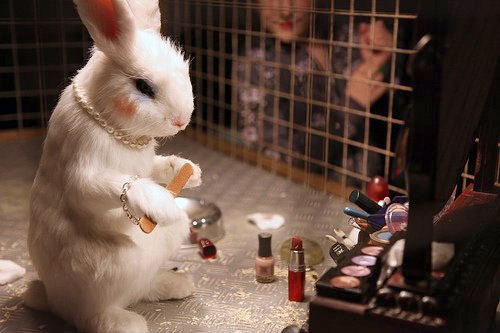 The overwhelming majority of rabbits do not choose to wear cosmetics, they are forced. Banksy’s rabbit is an exception to the rule. Animatronics. Pretty creepy stuff.
