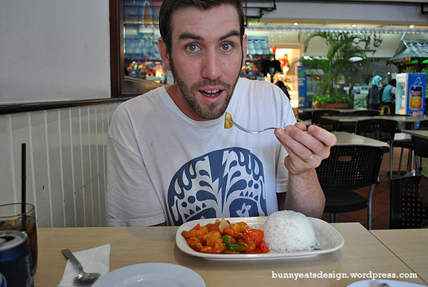 Our first meal was at Food Zone in the shopping complex by the big white mosque in town. Chinese Cuisine can be found here at a fair price. We ordered a Steamed Chicken Set, a Roast Chicken Set (both sets include chicken, chicken rice, pickles, sauces and soup), Sweet & Sour Prawns, Siu Mai (pork dumplings), Ha Gaw (prawn dumplings) and drinks.