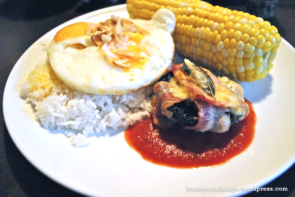 Served with fried eggs (with capers, fried garlic and worcester sauce), rice and buttered corn.