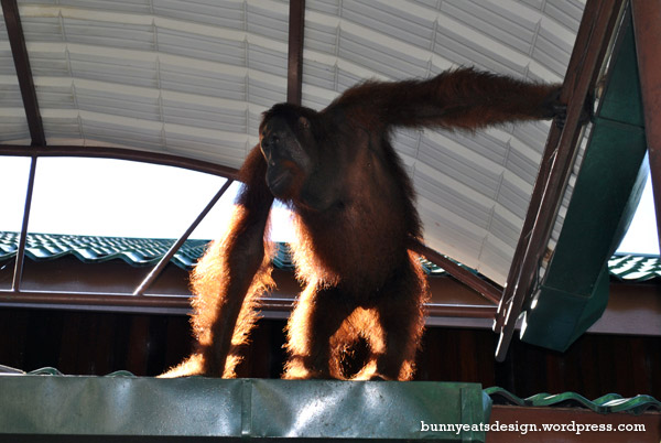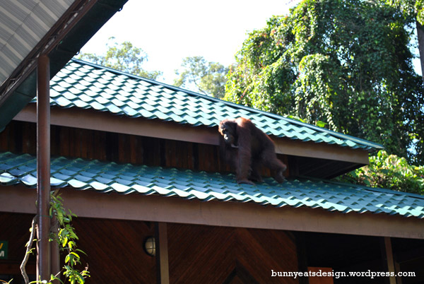 A ticket gives you a full day pass so we came for both the morning feeding and the afternoon one. This isn’t a zoo and the animals can roam where they please. We were waiting around near the entrance when I noticed something on the roof. It was an adult female climbing over the roof and she climbed over and headed right to where we were standing! The staff freaked out and got everyone indoors of the ticketing office until the orangutan moved on. She wasn’t menacing, but I’ve heard that an orangutan can rip a grown man’s arms off so I guess they didn’t want to take any chances.