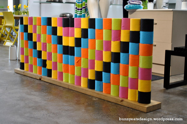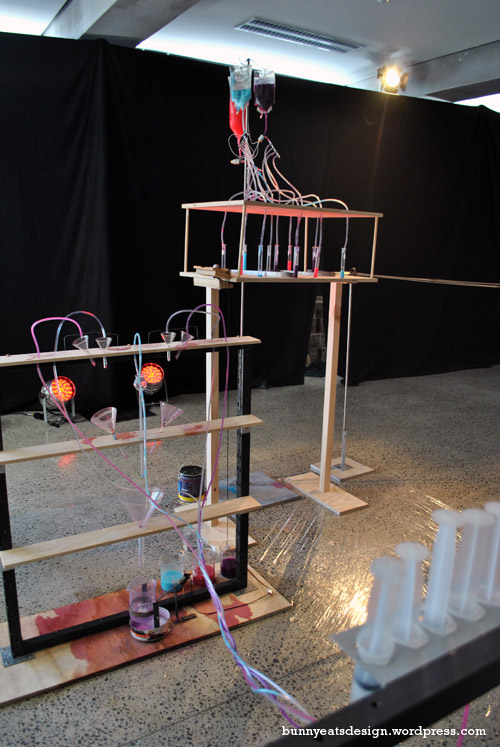 A Rube Goldberg contraption showcasing Dulux paint in collaboration with Furniture Lab and We Love Inc. I don’t know, something about a Rube Goldberg contraption brings out the kid in all of us. It’s exciting to watch with the anticipation of stuff happening in a linear way as well as the chance of failure. It’s like watching a really long set of dominos fall in line. The contraption required 5 volunteers to inject paint into tubes via syringe and the show went through several cycles while we were there.