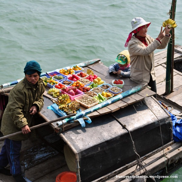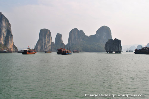 A continuous stream of tour boats head into Halong Bay and small boats motor from tour boat to tour boat selling fruit.
