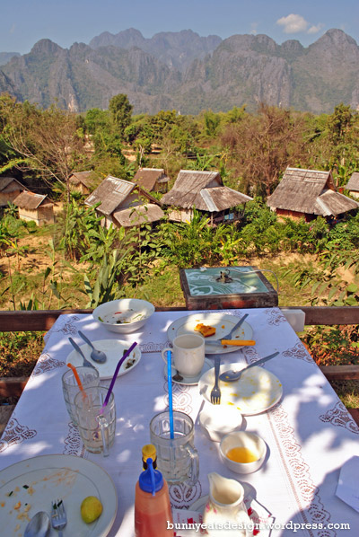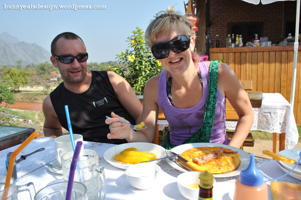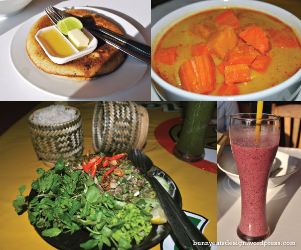One of the best places to eat in Vang Vieng for breakfast, lunch or dinner, is the Organic Mulberry Farm Cafe. The menu is pretty extensive and they have lots of shakes and juices as well. Here’s a mulberry pancake, a curry, a laap and a mulberry shake.