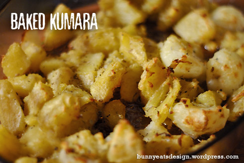 Instead of mash potatoes this time, I boiled kumara (sweet potato) and then gave them a good stir and finished them off in a hot oven. The trick is to get the kumara roughened up so that the rough bits crisp up nicely in the oven.