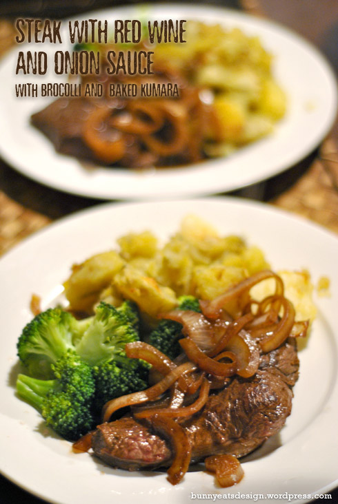I marinated a couple of slabs of steak in Worcestershire sauce and soy sauce. Then fried with slices of onion. As the steak was resting, I added red wine to the pan with a little flour and made a red wine and onion sauce. Brocolli made up the green component.