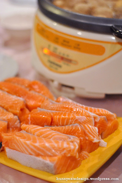 Fat slices of salmon. Om nom. These are to be watched carefully so they don’t overcook in the steamboat.