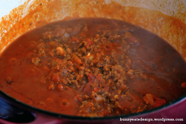 I made the meat sauce in the morning with beef and lamb mince, 1 onion, 4 garlic cloves, a can of pasta sauce, 1 pottle of tomato paste and a can of whole tomatoes. I browned and then simmered it for an hour and then left it alone until the evening.