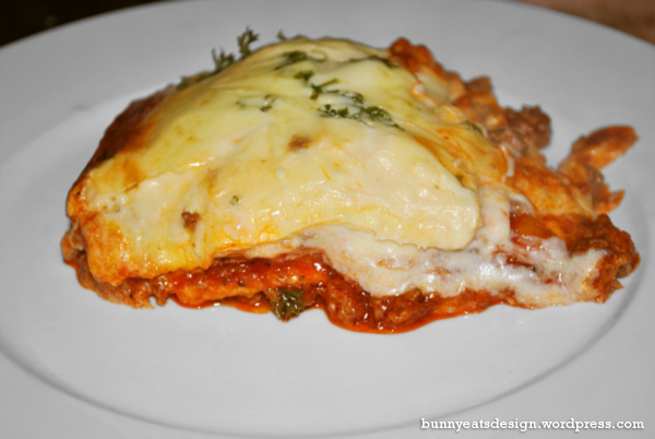My friend Miss A helped me with the cheesey white sauce. We used ricotta, milk, butter, flour, vintage cheddar. Meat sauce and cheese sauce layered between 4 sheets of fresh pasta and topped with more cheese sauce and a thin layer of mozzarella.