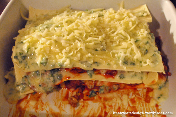 - Cut the 2 lasagna sheets in half. There will be 4 layers of pasta. In your mind, roughly divide the meat sauce and the cheese sauce into 4 as there will be 4 layers of each. Start layering the pasta/meat sauce/cheese sauce etc until you end up with a layer of pasta followed by cheese sauce at the top. Sprinkle grated mozzarella and more parsley if you wish on the top layer.