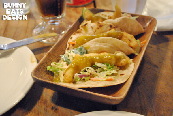 2. Battered snapper tortillas w/ slaw, coriander and green tomato salsa