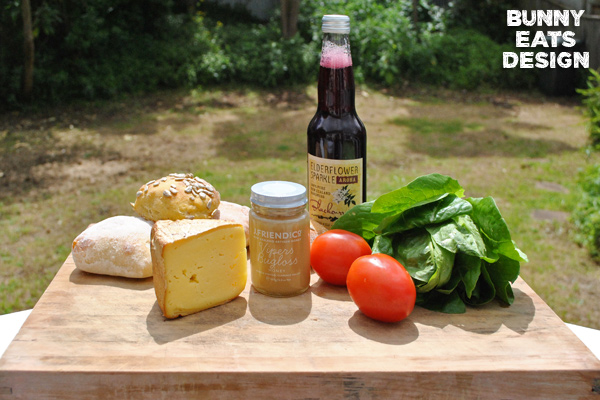 Ciabatta and kumara bambinos from Pukeko Bakery, smoked brie from NZ cheeseman, honey from J. Friend Co, Elderflower Sparkle in Blackcurrent by Aroha Drinks, egg shaped tomatoes and baby cos from Ray Chong.