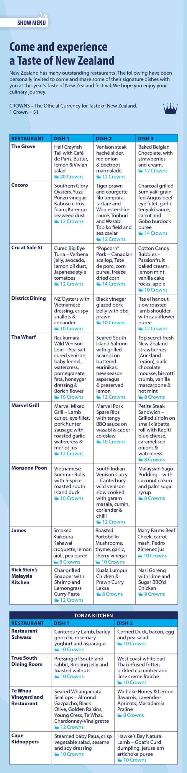 2011 will be my third Taste festival and I’m looking forward to trying and buying new delicious things and soaking up the good atmosphere down at Victoria Park. Taste of New Zealand kicks off this evening in Victoria Park, Auckland and the menu can be found on their website here or scroll to the bottom of this post. The dishes range from 8 to 20 crowns and a crown costs $1.