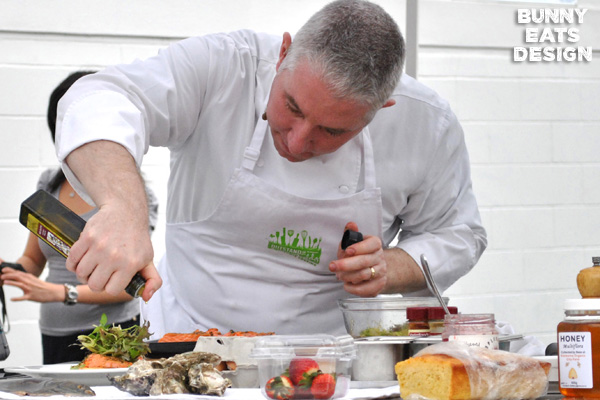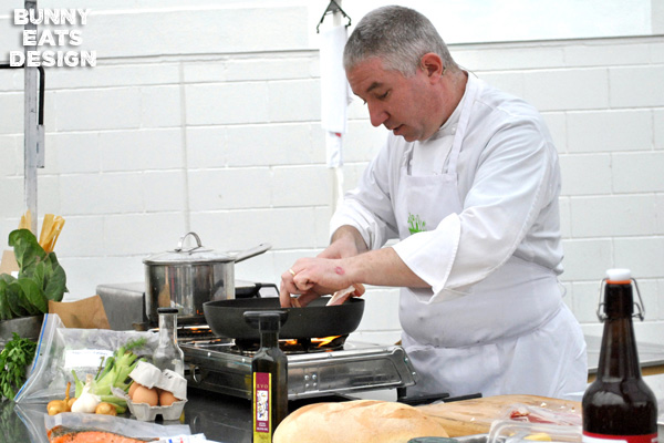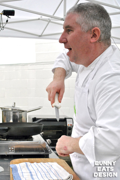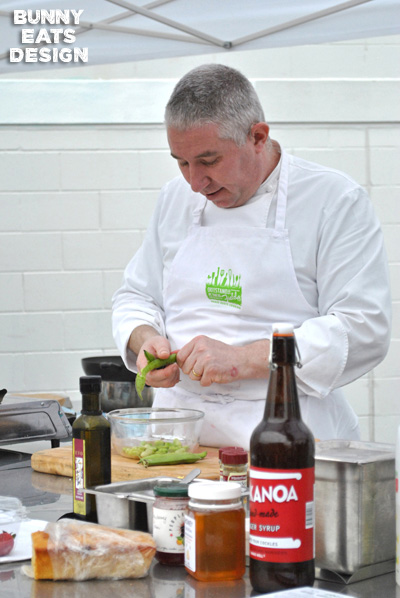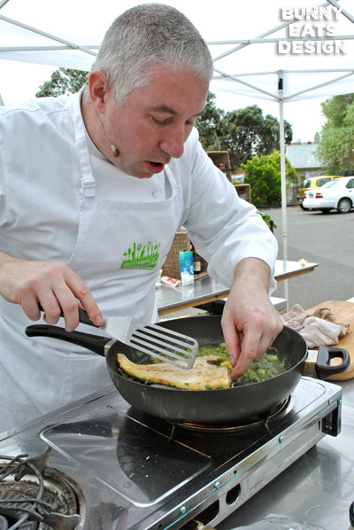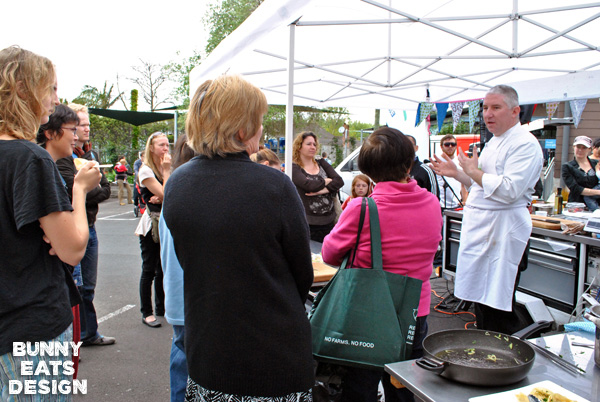 David Schofield is the 2011 New Zealand Chef of the Year this year and it was a pleasure to see him whip up some quick and delicious dishes on Sunday morning at the Grey Lynn Farmers’ Market. This was the very last of a national series of cooking demonstrations at farmers’ markets organised by Kylie and Blair from Out Standing In Their Fields. Farmers’ markets celebrate seasonal, local food and buying at your local producers is a great way to show your support.