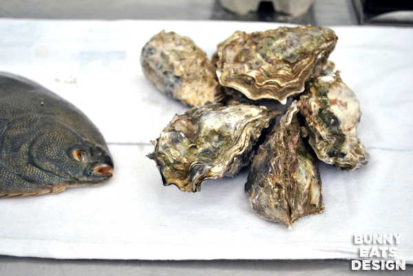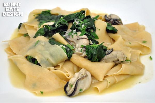 Oysters are available at the market in shells or shucked and into $15 tubes. It hasn’t been too long since my last oyster feast so I passed on buying oysters this time. David showed us how to open oysters (and also how not to) and quickly cooked some handmade lemon pappardelle (wide ribbons of pasta) with spinach and the fresh shucked oysters.