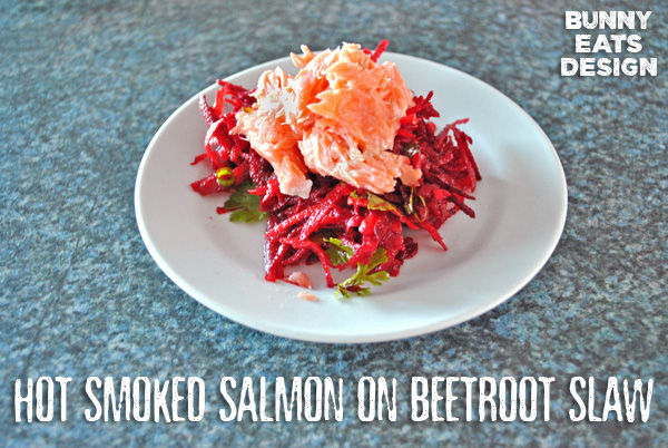 Salmon is my favourite fish and for dinner we had some hot smoked salmon on a quick beetroot salad. This sweet and sour salad has great fresh flavours to go with the rich fish. It looks pretty too.