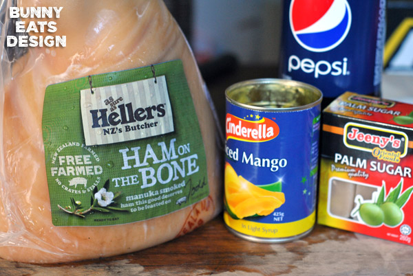 Pepsi dominates the Coke vs. Pepsi war in South East Asia and I wanted to do a ham glaze inspired by our SE Asia travels. I’ve eaten ham using tropical fruits and brown sugar in the past, so a variation of this using Pepsi, mango, pineapple and palm sugar sounded like it would well with savoury ham.