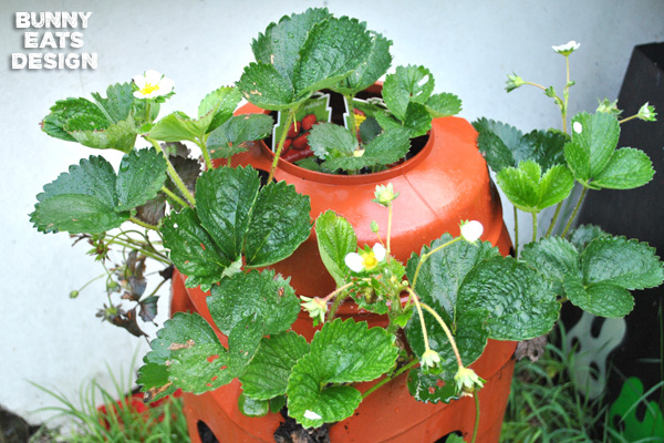 Oh but he did! We planted more strawberry plants than these. The lowest row in this barrel planter were 40-50cm up from the ground and were all eaten by Tofu within 24 hours of planting.