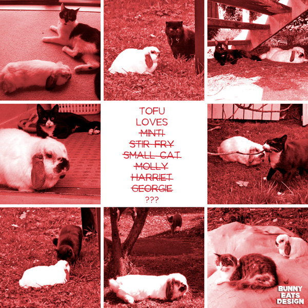 As long as you have an adult rabbit and a kitten or a cat you should be fine. When we first got Tofu and his brother, our flatmates had a young cat and she couldn’t help but torment the baby bunnies when she thought we weren’t looking. We would tell her off and she would stop tormenting and start licking instead.