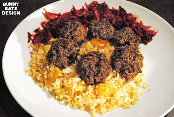 Beef meatballs with plum glaze, beetroot and carrot salad with pineapple egg fried rice.
