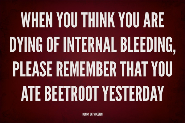 I’m with ya’. WIsh I”d read your public health warning prior to my first time eating fresh roasted beetroot and having had kittens the next morning! I “thought” for a minute and then realized what was rally going on – what a relief! Funny…