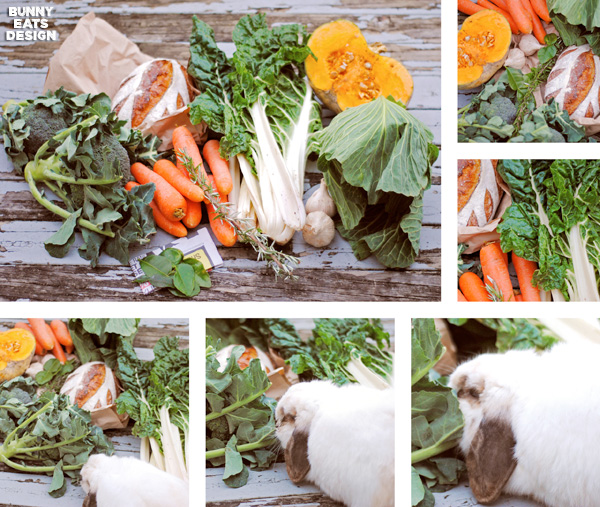 OOOOBY Box Week 3. I was photographing the CSA vegetables on our deck and who should just happen to come by? Tofu the rabbit thought he’d died and gone to heaven.