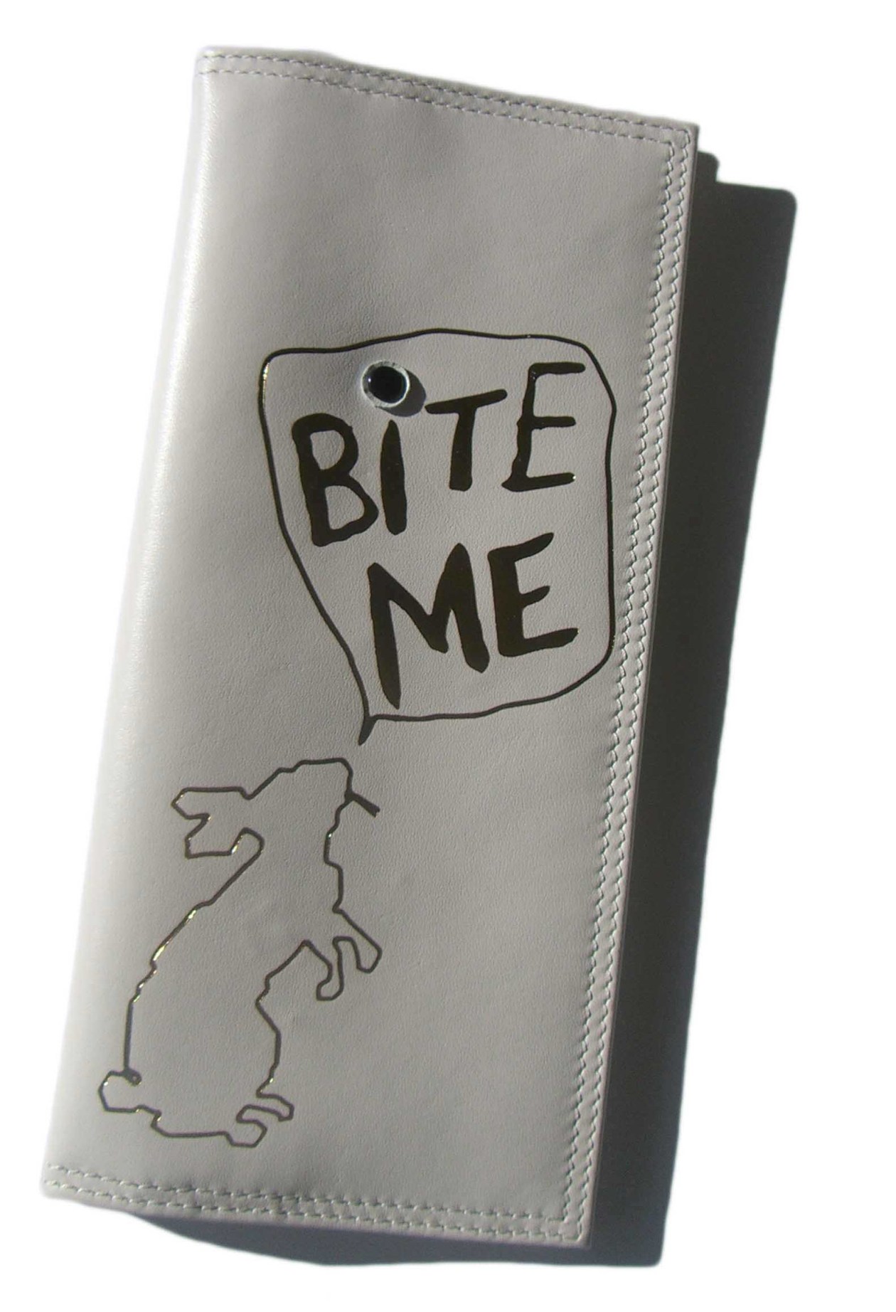 Sharon Paris started her company about 6 years ago calls herself an artist, but I beg to differ. She may have a BFA from The University of Auckland, but this is fashion design. The products she puts out in design shops all over the world are made from soft Italian leather, double stitched and are fully lined. It is quality stuff, fetching quality prices. The the that makes the brand interesting are it’s quirky phrases. Not what you would expect from high end luxury items. More reminiscent of bathroom graffiti.