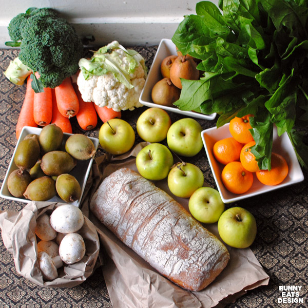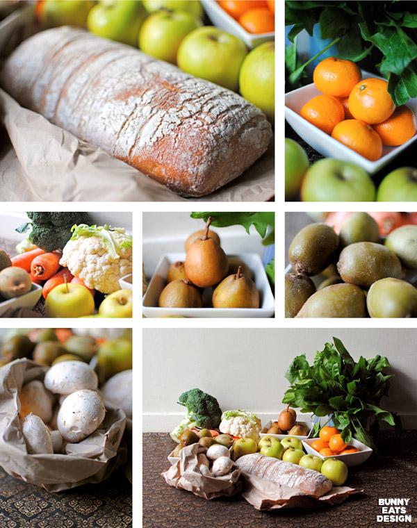 The produce looks like it is getting a lot more.. rounded? The first few weeks everything looked very organic but this week, it seems to look very .. perfect I suppose? That loaf of bread.. if i could reach a little further.. and grab .. it. Yum!