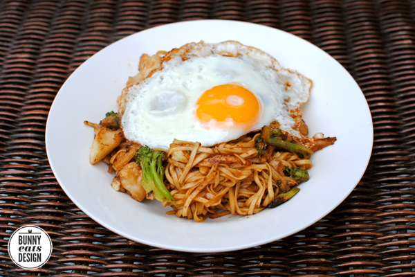 - In a separate frying pan, heat half a tablespoon of oil and crack 1 egg into it. Fry until done to your liking (I prefer a runny yolk to ooze into my noodles). Take off heat and set aside.