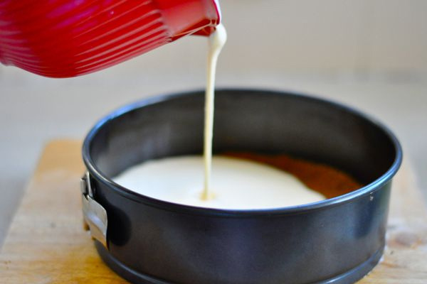 - Prepare base by processing the biscuits to a fine crumb. Melt the butter and add it to the crumbs and mix well. Press into a pie dish or a cake tin. I use a spring form cake tin, but a pie dish is fine.