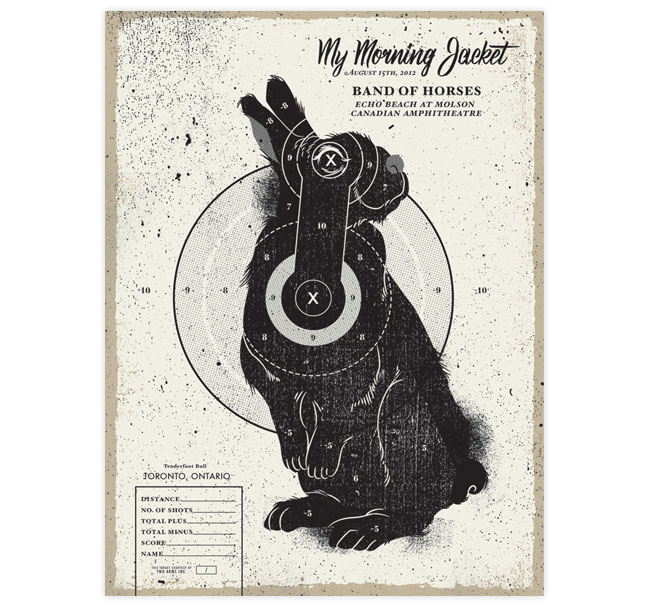 This gig poster for My Morning Jacket and Band of Horses features a bunny target. It implies violence but it’s just a graphic. I love it as a poster, but I wouldn’t shoot at it.