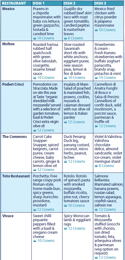 I recommend 3 to 4 dishes per person, depending on how many free samples you try. Take a foodie with similar tastes as you so you can share and double your tastings. The festival currency are Crowns which can be bought on site. 1 Crown = 1 dollar.