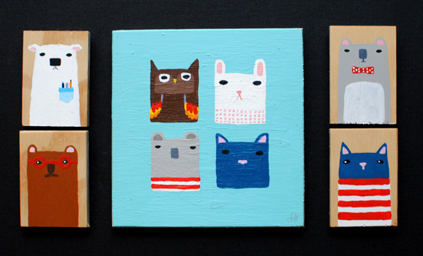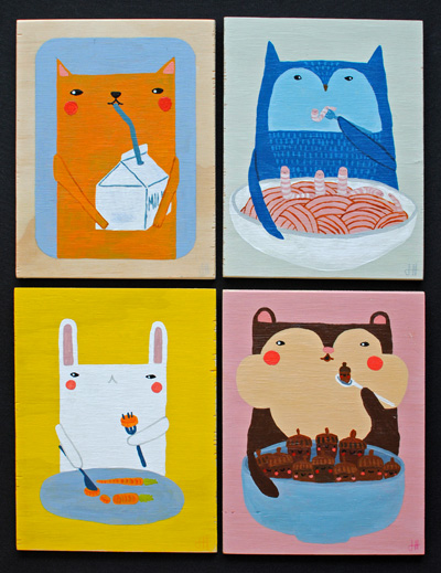 Some bunny and bunny friend paintings by Auckland artist Joanne Ho.