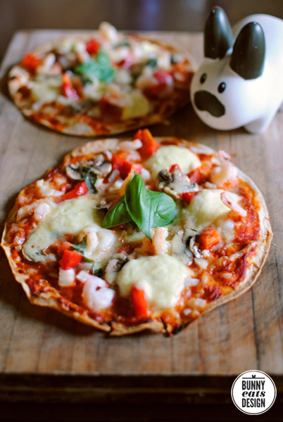 - Tortilla pizza with prawn or smoked chicken, cheddar, cherry tomatoes, basil and spinach leaves.