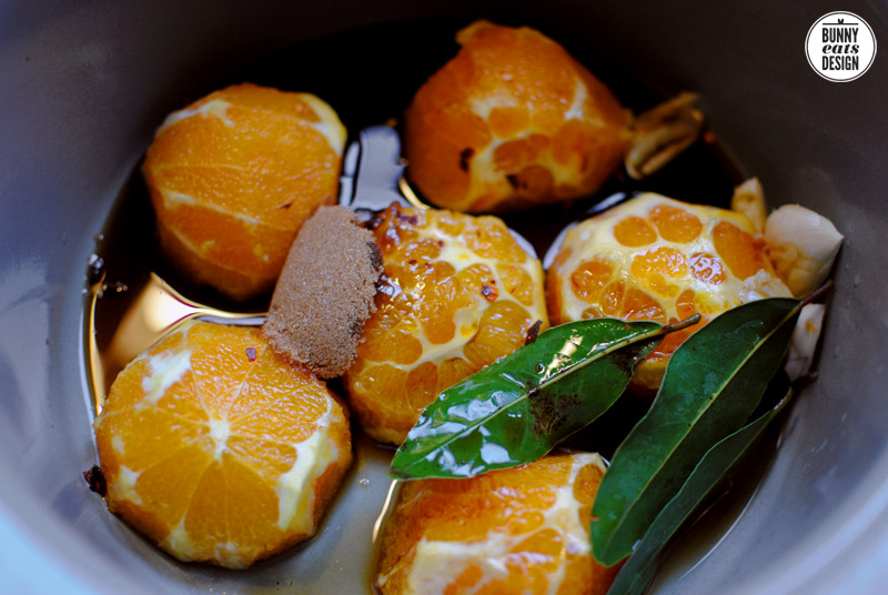 - Using a sharp knife, remove the peel from the oranges. Cut each orange in half, squeeze the juice into the slow cooker and then add the halves into the slow cooker, cut side down.